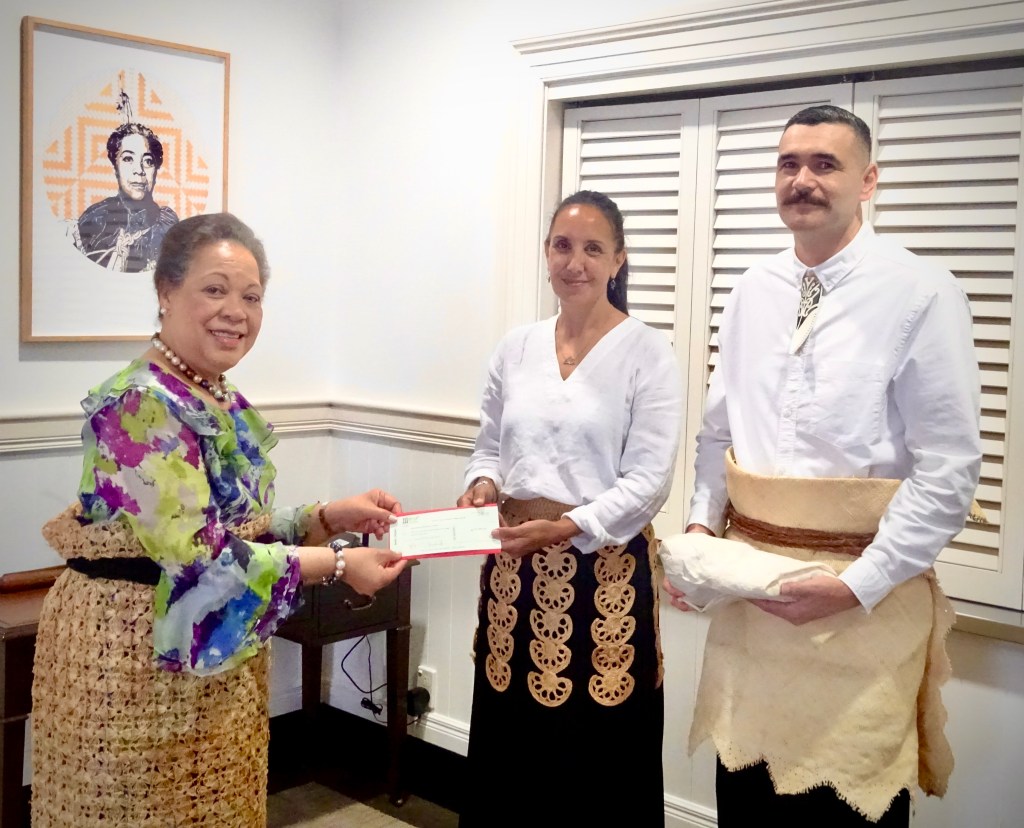 Ms Tanya Edwards (local visual artist) and Mr Benjamin Work (New Zealand Artist) and were received at the Royal Palace on Tuesday 17th October 2023 to present to Her Majesty Queen Nanasipau’u a donation of a cheque for $52,306.59 (TOP).